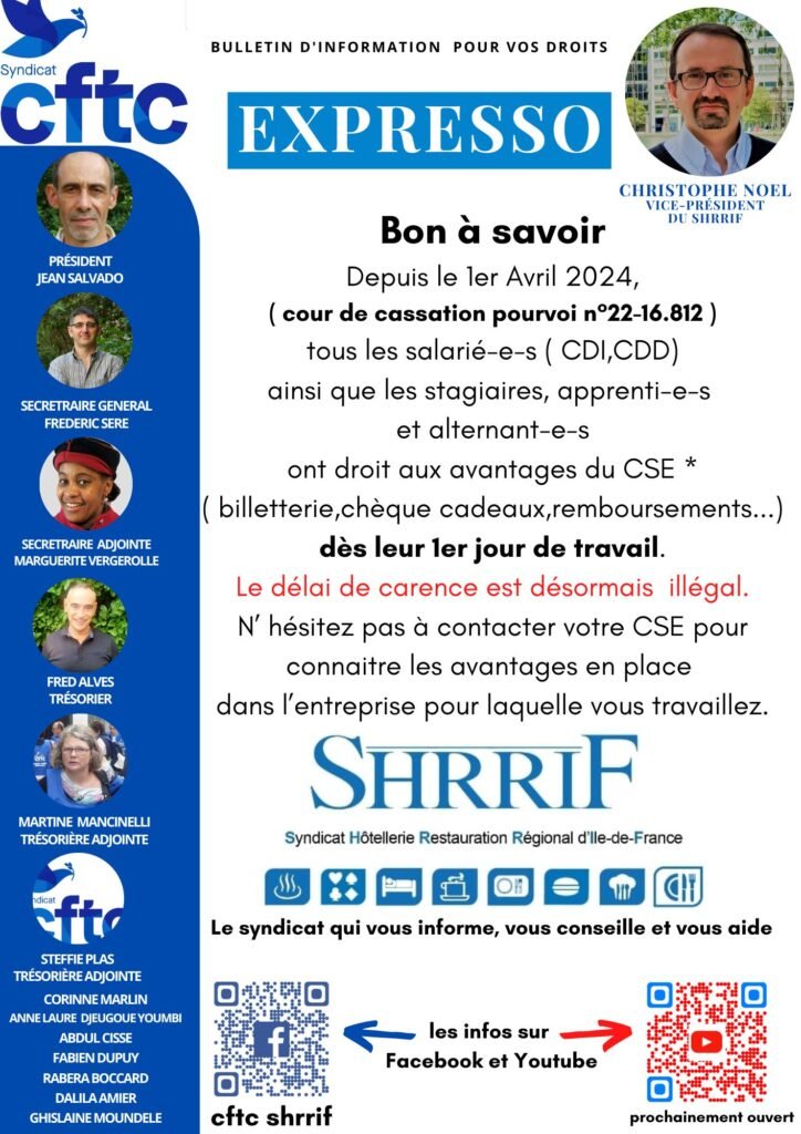 Avantages CSE : le délai de carence est supprimé !Home - Avantages CSE : le délai de carence est supprimé ! Avantages CSE : le délai de carence est supprimé ! Une question, un souci au travail, un besoin de conseil ? La CFTC SHRRIF est à votre écoute.Envoyez-nous un message via le formulaire ci-dessous, nous vous répondrons rapidement et en toute confidentialité. Remarque : JavaScript est requis pour ce contenu. Suivez nous :