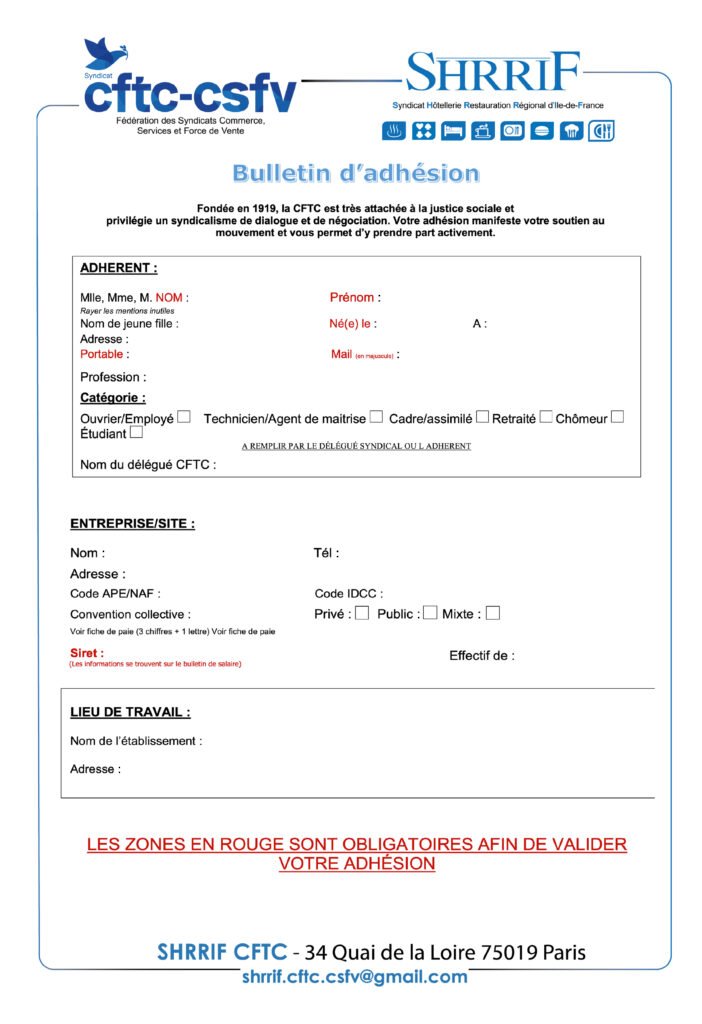 Bulletin d’adhésionHome - Bulletin d’adhésion Bulletin d’adhésion Pour télécharger votre bulletin d’adhésion complet 👉 Cliquez ici 👈 Envie de rejoindre la CFTC SHRRIF ? Vous partagez nos valeurs et souhaitez défendre vos droits au travail ?Contactez-nous via le formulaire ci-dessous pour toute information sur l’adhésion ou pour être accompagné dans vos démarches. Remarque : JavaScript est requis pour ce contenu. Suivez nous :