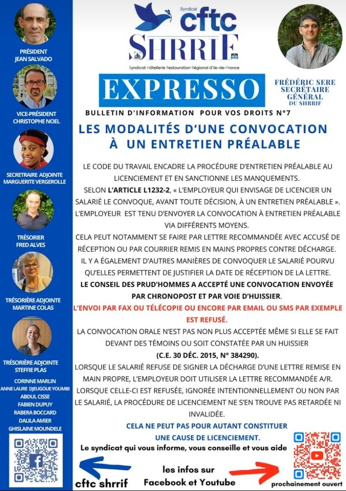 Les modalités d’une convocation à un entretien préalableHome - Les modalités d’une convocation à un entretien préalable Les modalités d'une convocation à un entretien préalable Une question, un souci au travail, un besoin de conseil ? La CFTC SHRRIF est à votre écoute.Envoyez-nous un message via le formulaire ci-dessous, nous vous répondrons rapidement et en toute confidentialité. Remarque : JavaScript est requis pour ce contenu. Suivez nous :