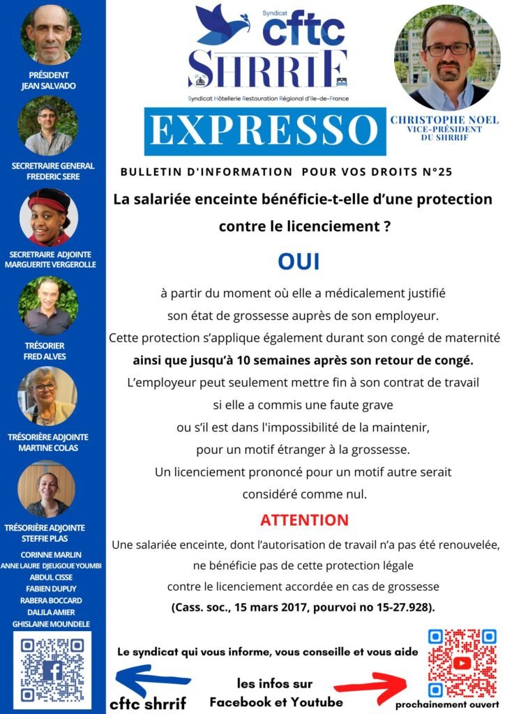 protection licenciement salariée enceinteHome - protection licenciement salariée enceinte La salariés enceinte bénéficie-t-elle d'une protection contre le licenciement ? Une question, un souci au travail, un besoin de conseil ? La CFTC SHRRIF est à votre écoute.Envoyez-nous un message via le formulaire ci-dessous, nous vous répondrons rapidement et en toute confidentialité. Remarque : JavaScript est requis pour ce contenu.